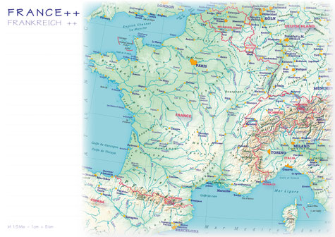 Eine physische Übersichtskarte von Frankreich und Nachbarländern mit Platz für Notizen, z.B. für Reisebüros oder als Urlaubsvorbereitung oder zu Planungszwecken.