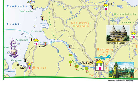 Eine Deutschlandkarte mit Vignetten und Symbolen - nicht nur für Kinder. Ich habe ein paar wenige Teile einer Karte hervorgehoben zu einem Karten-Bild.