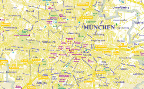 München als Übersichtskarte an der Wand mit mehr oder weniger Inhalt. Hier mit den wichtigsten Straßennamen, Stadtteilen und Sehenswürdigkeiten.