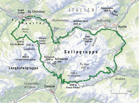 mit der MTB-Strecke Sellarunde. Eine Übersichtskarte für ein Radmagazin zu einem Radtouren-Artikel.